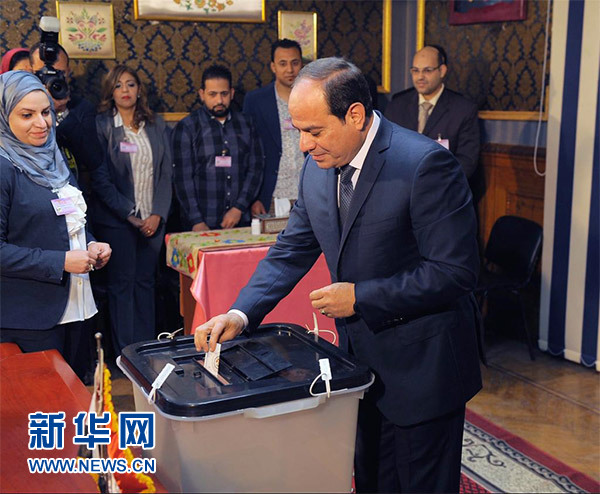這張資料照片顯示的是,3月26日,塞西在埃及首都開羅一個(gè)投票站參加總統(tǒng)選舉投票。新華社/中東社