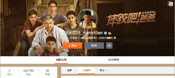 阿米爾·汗在中國社交媒體上的粉絲數(shù)過百萬,