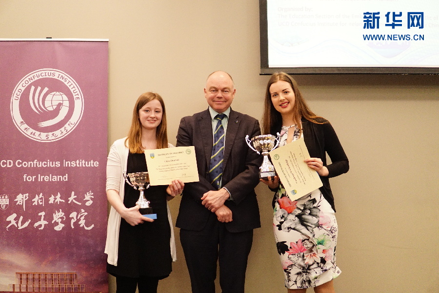 嘉賓和比賽二等獎獲得者合影。4月7日,第17屆“漢語橋”世界大學(xué)生中文比賽愛爾蘭賽區(qū)選拔賽在首都都柏林舉行。新華網(wǎng)發(fā)