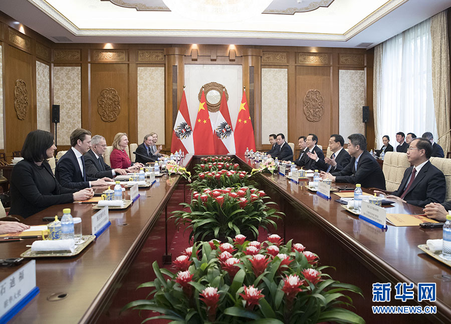 李克強(qiáng)歡迎范德貝倫總統(tǒng)和庫(kù)爾茨總理聯(lián)袂訪華。他表示,奧地利是中國(guó)在歐洲的重要伙伴。習(xí)近平主席同總統(tǒng)先生舉行會(huì)談,共同規(guī)劃兩國(guó)關(guān)系未來(lái)發(fā)展。中方愿同奧方抓住機(jī)遇,對(duì)接發(fā)展戰(zhàn)略,深化人文交流合作,加強(qiáng)在國(guó)際事務(wù)中的溝通協(xié)調(diào),全面提升兩國(guó)關(guān)系水平。