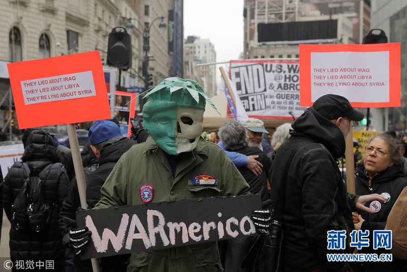 4月15日,美國(guó)紐約,民眾舉行反戰(zhàn)游行,抗議美英法聯(lián)軍襲擊敘利亞。(圖片來源:視覺中國(guó))