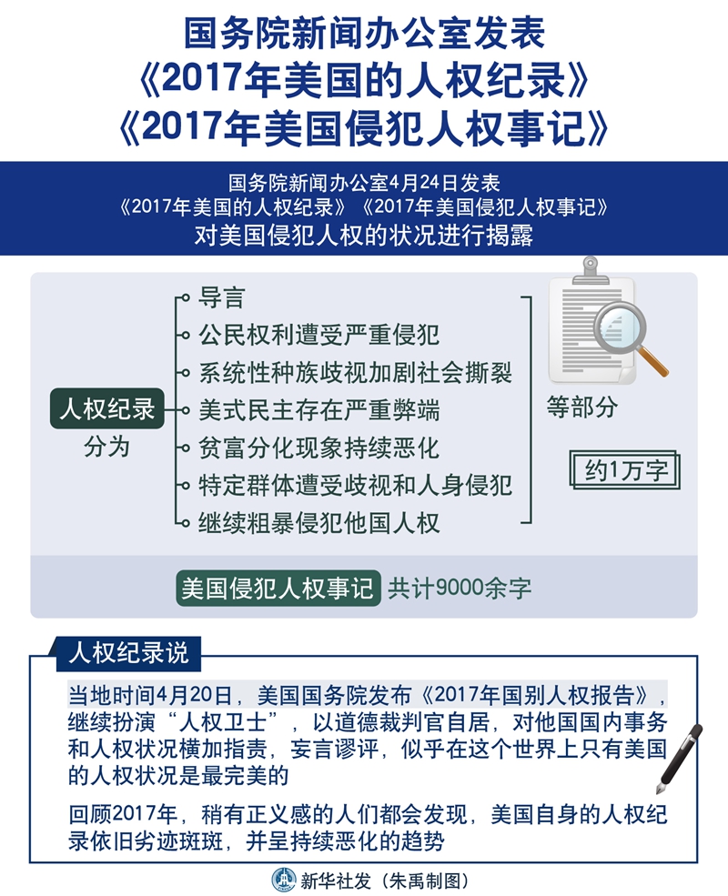 圖表:國務(wù)院新聞辦公室發(fā)表《2017年美國的人權(quán)紀錄》《2017年美國侵犯人權(quán)事記》 新華社發(fā)朱禹 制圖