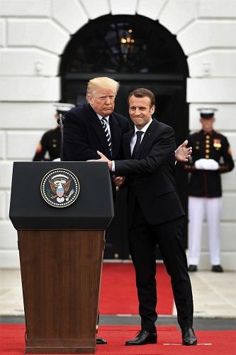 2018年4月24日,在美國華盛頓白宮,美國總統(tǒng)特朗普(左)與到訪的法國總統(tǒng)馬克龍出席歡迎儀式。 新華社記者楊承霖?cái)z