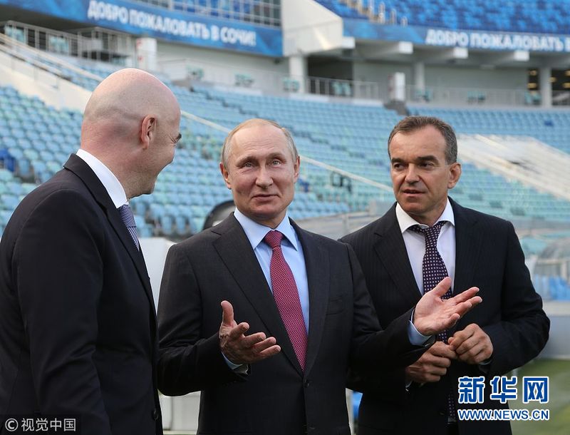5月3日,俄羅斯索契,俄羅斯總統(tǒng)普京與國(guó)際足聯(lián)主席因凡蒂諾參觀菲什特奧林匹克體育場(chǎng)。(圖片來(lái)源:視覺中國(guó))