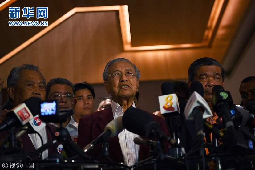 當(dāng)?shù)貢r(shí)間2018年5月9日,馬來西亞吉隆坡,馬哈蒂爾代表希望聯(lián)盟召開新聞發(fā)布會(huì)。9日,馬來西亞國會(huì)大選結(jié)束。10日凌晨官方點(diǎn)票結(jié)果顯示,前總理馬哈蒂爾(Mahathir)帶領(lǐng)的希望聯(lián)盟取得112席簡單多數(shù)國會(huì)議席,足以籌組政府及勝出大選,并終結(jié)執(zhí)政國民陣線長達(dá)60年的管治?,F(xiàn)總理納吉布領(lǐng)導(dǎo)的國民陣線僅獲得76席。(圖片來源:視覺中國)