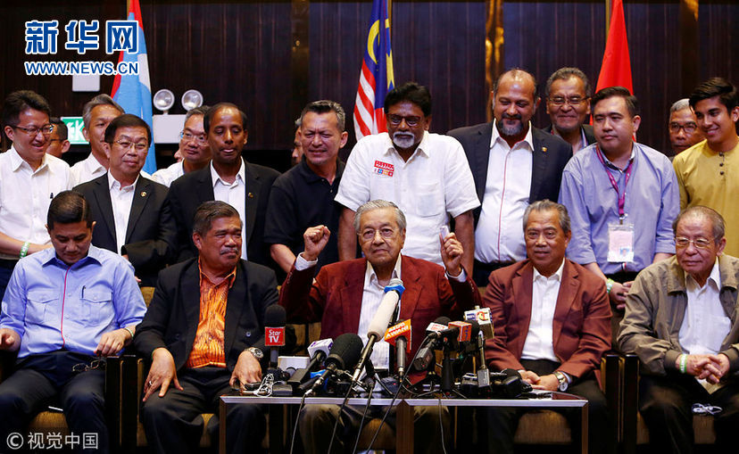 當(dāng)?shù)貢r(shí)間2018年5月9日,馬來西亞吉隆坡,馬哈蒂爾代表希望聯(lián)盟召開新聞發(fā)布會。9日,馬來西亞國會大選結(jié)束。10日凌晨官方點(diǎn)票結(jié)果顯示,前總理馬哈蒂爾(Mahathir)帶領(lǐng)的希望聯(lián)盟取得112席簡單多數(shù)國會議席,足以籌組政府及勝出大選,并終結(jié)執(zhí)政國民陣線長達(dá)60年的管治。現(xiàn)總理納吉布領(lǐng)導(dǎo)的國民陣線僅獲得76席。(圖片來源:視覺中國)