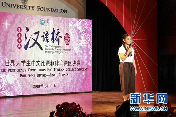5月11日,在菲律賓安赫萊斯市,此次比賽的冠軍安梓彤在演講。第17屆“漢語橋”世界大學(xué)生中文比賽菲律賓賽區(qū)決賽11日在菲律賓安赫萊斯市舉行。 新華社發(fā)(董成文攝)