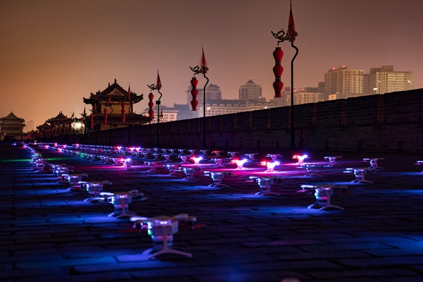 本次挑戰(zhàn)所呈現(xiàn)的1374架無人機翱翔西安城墻上空,刷新了英特爾于2017年12月在韓國平昌創(chuàng)下的1218架“最多無人機同時飛行”吉尼斯稱號。