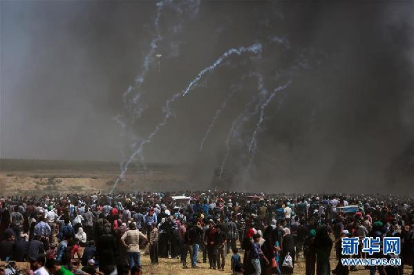 5月14日,在加沙城以東的加沙地帶與以色列交界地區(qū),巴勒斯坦示威者與以色列軍隊(duì)發(fā)生沖突。巴勒斯坦民眾14日在巴各地舉行大規(guī)模游行示威,抗議美國(guó)駐以色列使館在耶路撒冷開(kāi)館。新華社發(fā)