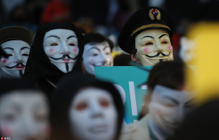 當?shù)貢r間2018年5月18日,韓國首爾,大韓航空有限公司的飛行員戴著蓋伊·??怂姑婢撸谑谞柺袇^(qū)集會抗議,反對大韓航空會長兼首席執(zhí)行官趙亮鎬及其家庭。