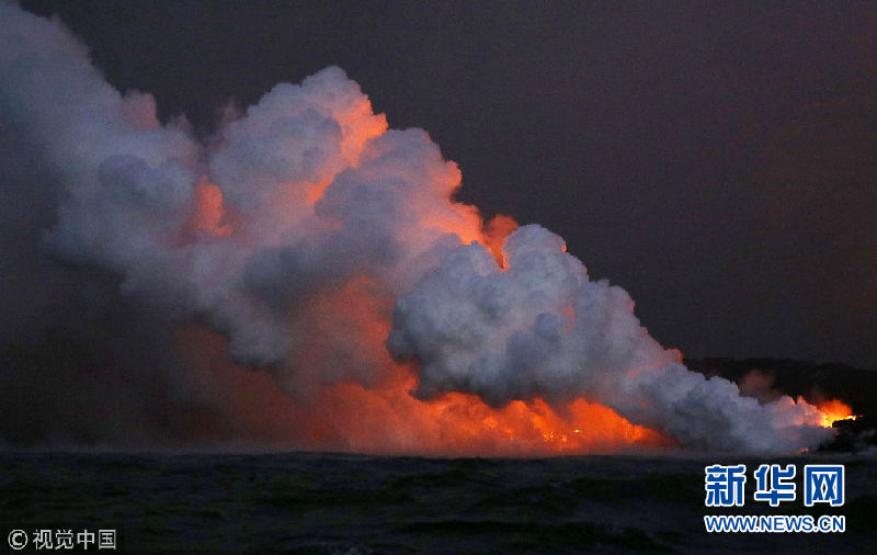 夏威夷火山熔巖流入太平洋 有毒“蒸汽云”升騰火光交映
