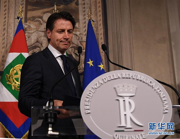 5月27日,在意大利首都羅馬,意新任總理孔特發(fā)表講話。據(jù)當(dāng)?shù)孛襟w報(bào)道,孔特27日晚間與總統(tǒng)馬塔雷拉會(huì)面并提交擬定的內(nèi)閣成員名單時(shí),馬塔雷拉否決了由意大利聯(lián)盟黨和五星運(yùn)動(dòng)力推的持疑歐立場(chǎng)的經(jīng)濟(jì)學(xué)家保羅·薩沃納出任財(cái)政部長(zhǎng)??滋叵蚩偨y(tǒng)提出放棄組閣任務(wù)請(qǐng)求,請(qǐng)求得到總統(tǒng)確認(rèn)。新華社發(fā)(阿爾貝托·林格里亞攝)