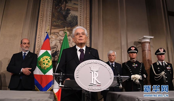 5月27日,在意大利首都羅馬,意總統(tǒng)馬塔雷拉發(fā)表講話。據(jù)當(dāng)?shù)孛襟w報(bào)道,意大利新任總理孔特27日晚間與總統(tǒng)馬塔雷拉會(huì)面并提交擬定的內(nèi)閣成員名單時(shí),馬塔雷拉否決了由意大利聯(lián)盟黨和五星運(yùn)動(dòng)力推的持疑歐立場(chǎng)的經(jīng)濟(jì)學(xué)家保羅·薩沃納出任財(cái)政部長(zhǎng)。孔特向總統(tǒng)提出放棄組閣任務(wù)請(qǐng)求,請(qǐng)求得到總統(tǒng)確認(rèn)。新華社發(fā)(阿爾貝托·林格里亞攝)