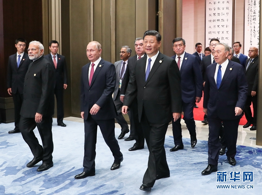 新華社青島6月10日電(記者孫奕、溫馨)上海合作組織成員國元首理事會第十八次會議小范圍會談10日在青島國際會議中心舉行。國家主席習近平主持。印度總理莫迪、哈薩克斯坦總統(tǒng)納扎爾巴耶夫、吉爾吉斯斯坦總統(tǒng)熱恩別科夫、巴基斯坦總統(tǒng)侯賽因、俄羅斯總統(tǒng)普京、塔吉克斯坦總統(tǒng)拉赫蒙、烏茲別克斯坦總統(tǒng)米爾濟約耶夫出席會議。各成員國領(lǐng)導人就上海合作組織發(fā)展以及重大國際和地區(qū)問題交換意見。
