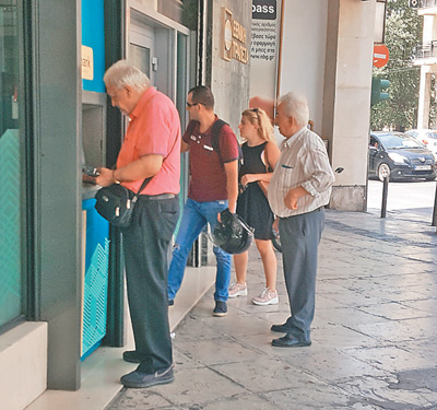 在希臘放松資本管制后,取款的希臘民眾增多。圖為雅典市民正在自動取款機(jī)前排隊取款。記者 葉琦攝