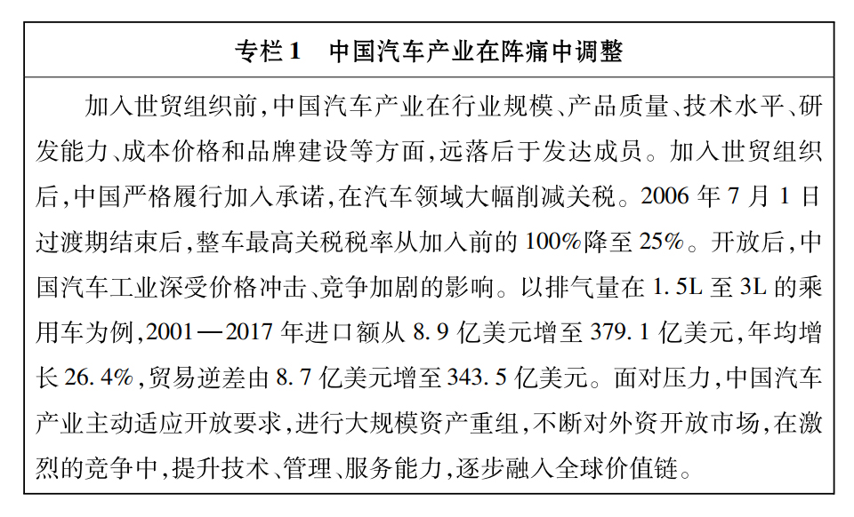 中國在加入世貿(mào)組織時(shí)作出廣泛而深入的開放承諾,國內(nèi)企業(yè)直接面對(duì)國際競爭,多數(shù)產(chǎn)業(yè)面臨較大困難。中國企業(yè)主動(dòng)應(yīng)對(duì)挑戰(zhàn),大力推進(jìn)產(chǎn)業(yè)結(jié)構(gòu)調(diào)整,積極參與全球價(jià)值鏈,國際競爭力明顯提升。