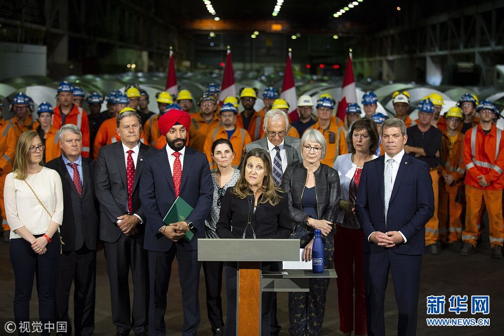 當地時間2018年6月29日,加拿大漢密爾頓,加拿大外交部長弗里蘭、經濟發(fā)展部長貝恩斯和勞工部長哈伊杜造訪斯特爾科鋼鐵公司,并共同宣布從7月1日起,加拿大將對約126億美元從美國進口的商品加征關稅,以報復特朗普政府對加拿大鋼鋁產品加征關稅。他們還表示,加拿大政府將向本國鋼鋁產業(yè)和制造業(yè)提供約15億美元財政援助。(圖片來源:視覺中國)