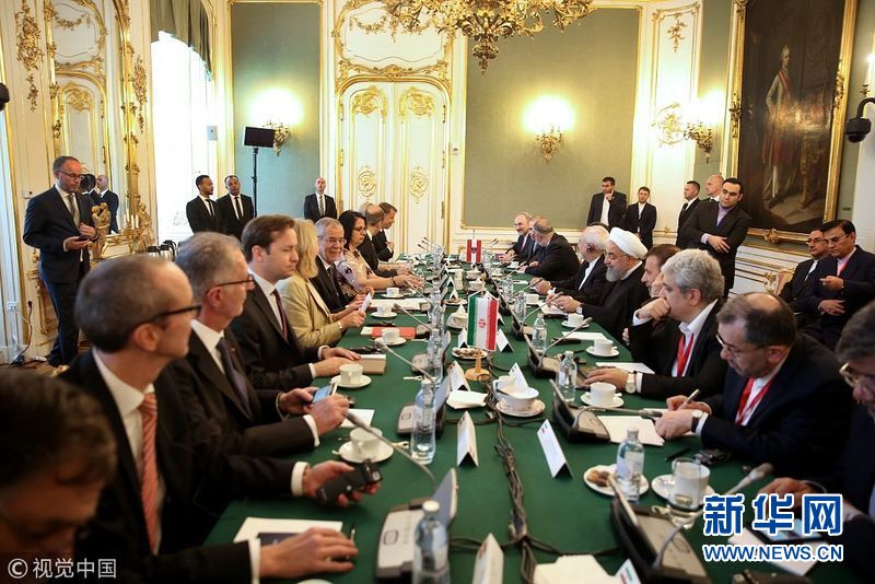 2018年7月4日,奧地利維也納,伊朗總統(tǒng)魯哈尼抵達(dá)奧地利進(jìn)行訪問,會晤奧地利總統(tǒng)范德貝倫和總理塞巴斯蒂安·庫爾茨。伊朗總統(tǒng)魯哈尼2日出發(fā)前往瑞士和奧地利訪問。他這次西歐行將重點(diǎn)討論伊朗核問題全面協(xié)議。(圖片來源:視覺中國)