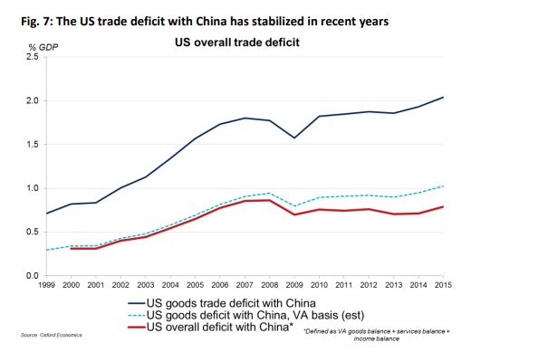 而如果再算上美國(guó)在服務(wù)領(lǐng)域?qū)χ袊?guó)的順差,以及美國(guó)對(duì)華投資的各項(xiàng)收益,那么中美之間實(shí)際的逆差更會(huì)進(jìn)一步縮小到美國(guó)GDP的0.8%。