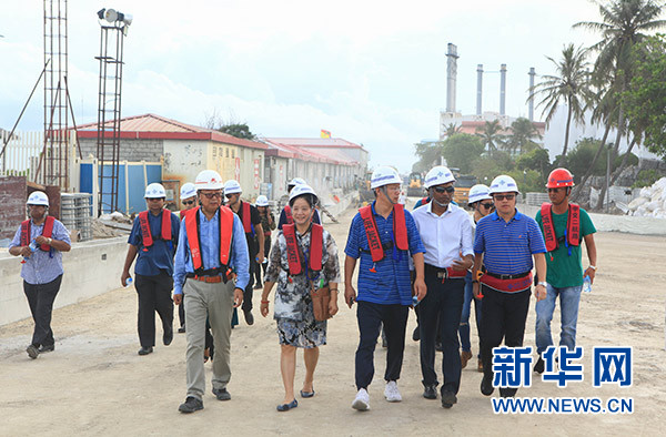 7月11日,在馬爾代夫首都馬累,馬爾代夫住房和基建部長(zhǎng)穆伊祖(前右二)在中馬友誼大橋建設(shè)現(xiàn)場(chǎng)參觀。新華社發(fā)(王明亮攝)