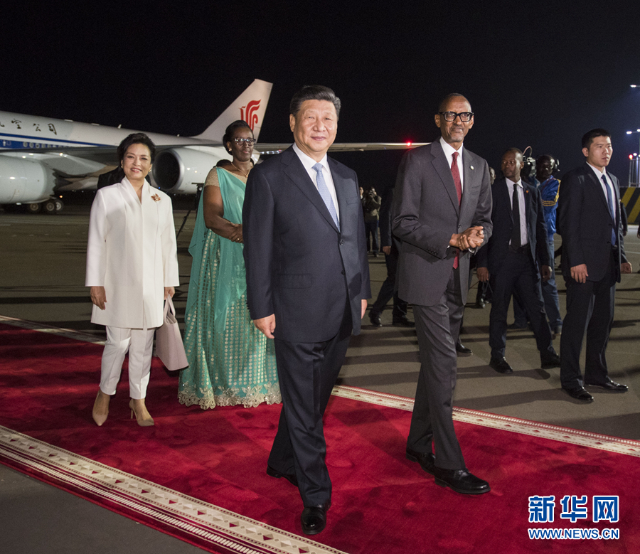習近平是在結(jié)束對塞內(nèi)加爾國事訪問后抵達基加利的。離開達喀爾時,習近平出席塞內(nèi)加爾總統(tǒng)薩勒在機場舉行的歡送儀式。習近平和彭麗媛抵達機場時,薩勒和夫人瑪麗梅在停車處迎接。兩國元首夫婦一同前往停機坪。兩國元首登上檢閱臺。軍樂隊奏中塞兩國國歌。習近平在薩勒陪同下檢閱儀仗隊。習近平和彭麗媛同塞方送行人員道別。薩勒夫婦同中方陪同人員道別。