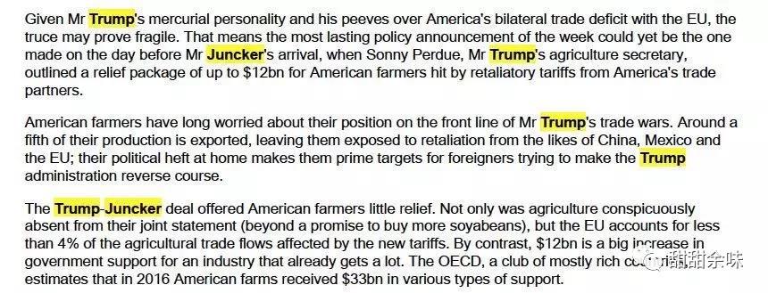 2.從英國媒體的報道切入點來看,英國作為歐洲國家的重要代表(雖然英國已經(jīng)發(fā)布了脫歐白皮書,但是在歐盟的官網(wǎng)上,歐盟的28個國家里,目前仍然是包括了United Kingdom的),對美國對外咋咋呼呼給各國添亂、實際上不動聲色自有打算的做法并不感冒。管中窺豹,或可判斷容克代表歐盟剛剛表過的態(tài)的不確定性將進一步上升,除了德國、法國之外,英國也不可能真的跟美國好到一個鼻孔出氣。更不要說在歐盟內(nèi)部農(nóng)業(yè)出口占大頭的其他國家。