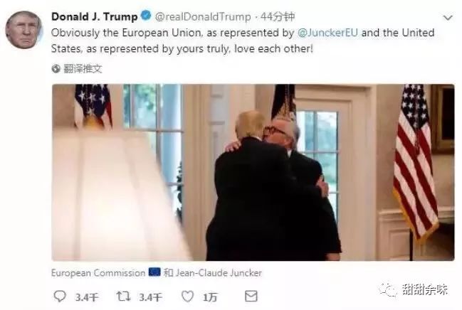 畢竟,到訪美國的歐盟委員會主席容克,不僅得到了美國媒體濃墨重彩的報道,更在特朗普的推特上,將白宮玫瑰園的浪漫延續(xù)了下去——《經(jīng)濟學人》給這次見面取了個唯美貼切的標題:Sealed with a kiss(以吻封緘)。(哈哈哈,莫名覺得這首歐美經(jīng)典情歌用在這里居然有說不出的貼切,《經(jīng)濟學人》取標題的能力也真是要給個大寫的服字?。?/p>