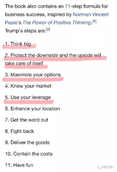 白宮及特朗普近期的表現(xiàn)看似散亂反復(fù),實際上并非無跡可循。有個重要的樣本,就是特朗普本人的作品《交易的藝術(shù)》(The Art of the Deal)。他在書中回顧自己各種交易經(jīng)歷,總結(jié)出11條重要步驟。