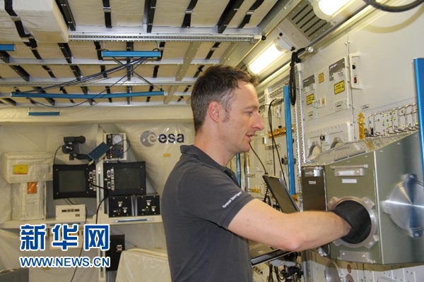 7月18日,在德國(guó)科隆,德國(guó)宇航員馬天(馬蒂亞斯·毛雷爾)在歐洲航天局哥倫布實(shí)驗(yàn)艙的模擬艙內(nèi)展示實(shí)驗(yàn)操作。 新華社記者張毅榮攝