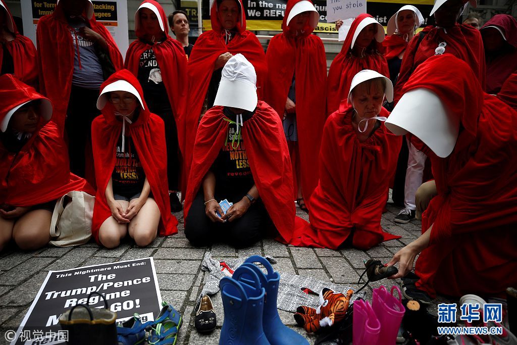 當(dāng)?shù)貢r(shí)間2018年7月31日,美國(guó)紐約,女性示威者扮成美劇《使女的故事》中的“使女”在亞歷山大·漢密爾頓海關(guān)大樓前示威,抗議美國(guó)總統(tǒng)特朗普和副總統(tǒng)麥克·彭斯。她們手持鞋子,代表被迫與父母分離的移民兒童。(圖片來(lái)源:視覺(jué)中國(guó))