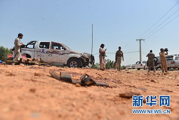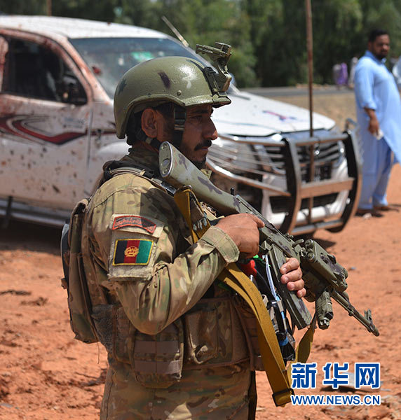 8月25日,在阿富汗賈拉拉巴德市,一名安全人員在炸彈爆炸襲擊地點(diǎn)警戒。 新華社發(fā)(薩菲 攝)