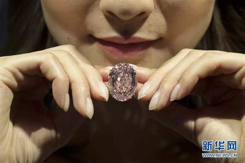 在中國香港蘇富比拍賣行,模特展示“粉紅之星”鉆石。新華社/歐新