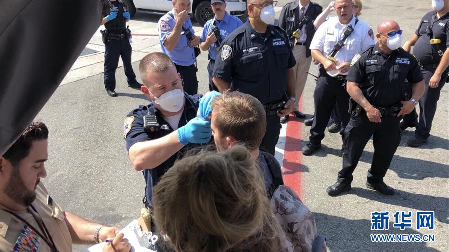 9月5日,在美國紐約肯尼迪機場,警察為阿聯(lián)酋航空公司EK203航班上的乘客查體溫。新華社發(fā)
