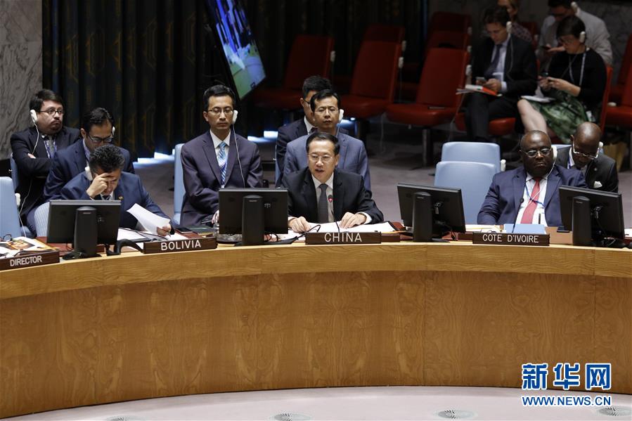 9月7日,在位于紐約的聯(lián)合國總部,中國常駐聯(lián)合國代表馬朝旭(前排中)在安理會敘利亞問題公開會上發(fā)言。新華社記者 李木子 攝