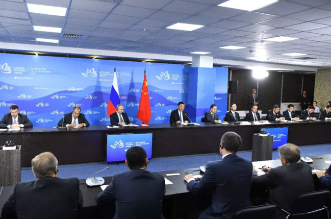 9月11日,國(guó)家主席習(xí)近平在符拉迪沃斯托克和俄羅斯總統(tǒng)普京共同出席中俄地方領(lǐng)導(dǎo)人對(duì)話會(huì)。 新華社記者 饒愛(ài)民攝