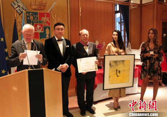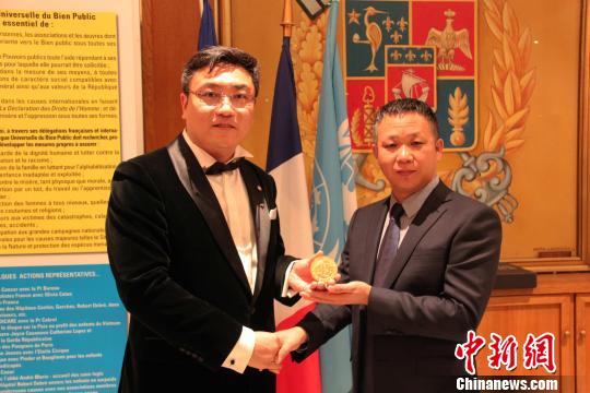 9月21日晚,中國(guó)工筆畫家崔景哲(左)在巴黎榮獲全球公益聯(lián)盟文學(xué)(藝術(shù))金質(zhì)勛章,也是此次頒獎(jiǎng)典禮所有獲獎(jiǎng)?wù)咧形ㄒ灰晃恢袊?guó)人。江蘇凱旋體育文化董事長(zhǎng)吳愛華等知名人士對(duì)崔景哲的獲獎(jiǎng)表示祝賀。李洋 攝