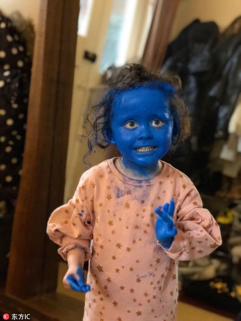 2018年4月17日?qǐng)?bào)道,國(guó)外3歲的小女孩Eve把自己涂抹成了“藍(lán)精靈”!(圖片來(lái)源:東方IC)