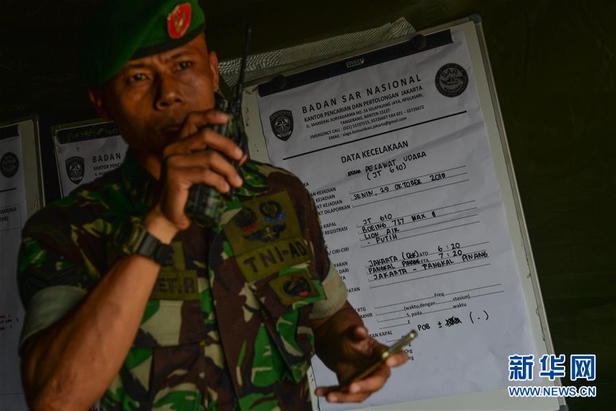 10月29日,在印度尼西亞雅加達,一名軍人站在客機搜救信息的展板前。新華社發(fā)(維里 攝)