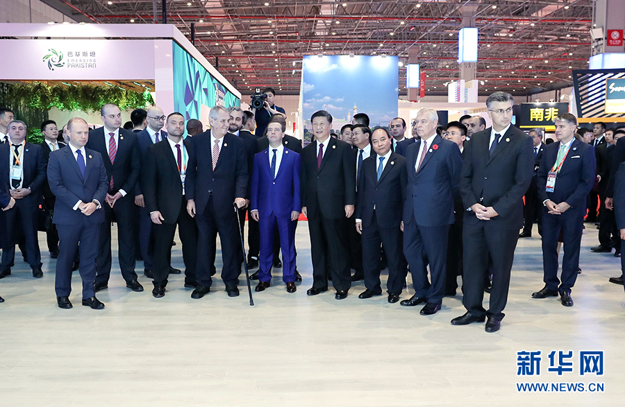 中午,習近平同外國領導人一同步入國家貿易投資綜合展展廳。他們邊走邊看,邊看邊談,先后參觀了匈牙利、埃及、英國、捷克、肯尼亞、薩爾瓦多、多米尼加、老撾、格魯吉亞、越南、巴基斯坦、俄羅斯等國展區(qū),了解各國經(jīng)貿發(fā)展成就和特色優(yōu)勢產(chǎn)品。習近平和各國領導人通過視頻欣賞了匈牙利的美麗風光、領略了埃及的悠久文明和現(xiàn)代發(fā)展規(guī)劃,共同體驗了英國館炫酷時尚的裸眼3D視頻。在捷克館,澤曼總統(tǒng)用捷克產(chǎn)鋼琴即興演奏一曲,并邀請習近平品嘗捷克啤酒??夏醽喌孽r花、薩爾瓦多的咖啡、多米尼加的水果,琳瑯滿目的各國特色產(chǎn)品吸引中外領導人頻頻駐足。格魯吉亞總理和越南總理親自向習近平推介本國農產(chǎn)品和旅游項目。老撾館的中老鐵路項目沙盤和巴基斯坦館的中巴經(jīng)濟走廊展板分別展現(xiàn)了中老、中巴共建“一帶一路”、實現(xiàn)共同發(fā)展的美好愿景。在俄羅斯館,習近平在梅德韋杰夫總理陪同下聽取中俄在核電、天然氣、飛機制造、地方交往等領域合作成就介紹,共同展望中俄合作的廣闊前景。