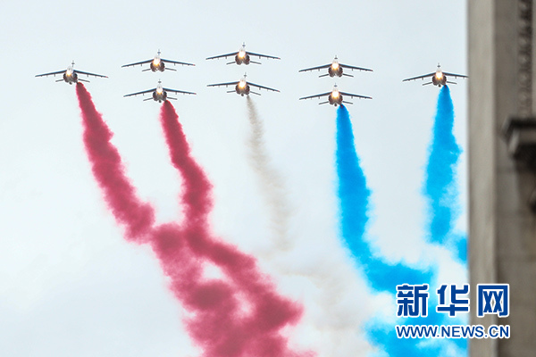 11月11日,法國空軍“法蘭西巡邏兵”飛行表演隊在一戰(zhàn)結(jié)束百年紀(jì)念儀式上飛過巴黎凱旋門。 新華社記者 鄭煥松 攝