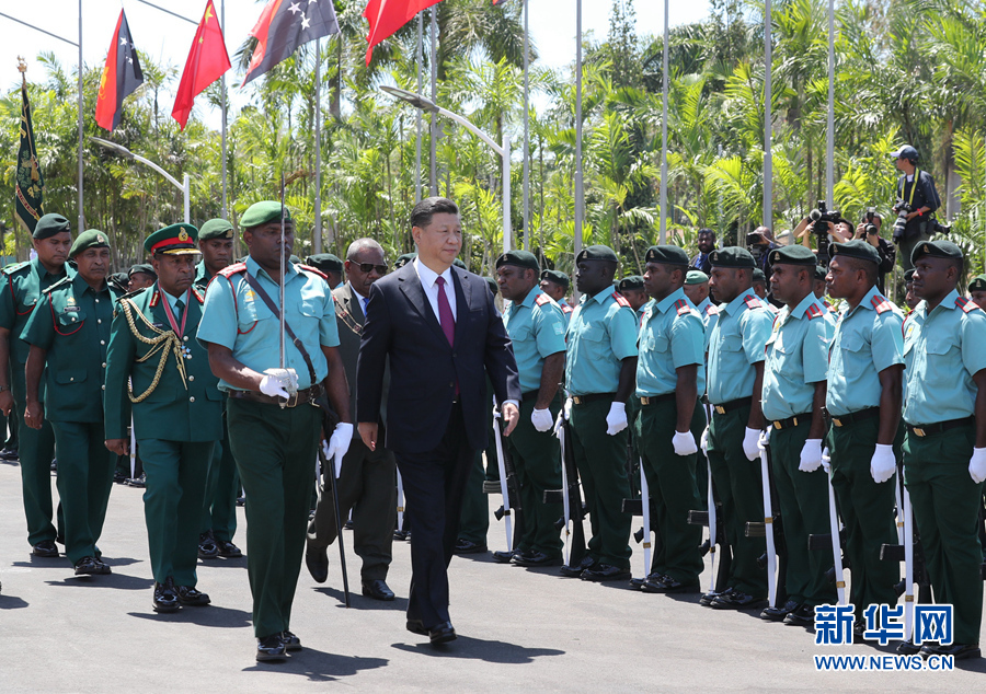 11月16日,國家主席習(xí)近平在莫爾茲比港會見巴布亞新幾內(nèi)亞總督達(dá)達(dá)埃。會見開始前,達(dá)達(dá)埃在議會大廈前廣場為習(xí)近平舉行隆重歡迎儀式。新華社記者 丁林 攝