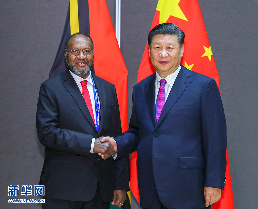 11月16日,國家主席習(xí)近平在莫爾茲比港分別會見建交太平洋島國領(lǐng)導(dǎo)人。這是習(xí)近平會見紐??偫硭?。 新華社記者 丁林 攝