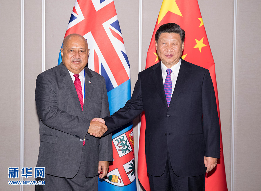 11月16日,國家主席習(xí)近平在莫爾茲比港會見斐濟政府代表、國防部長昆布安博拉。 新華社記者 黃敬文 攝