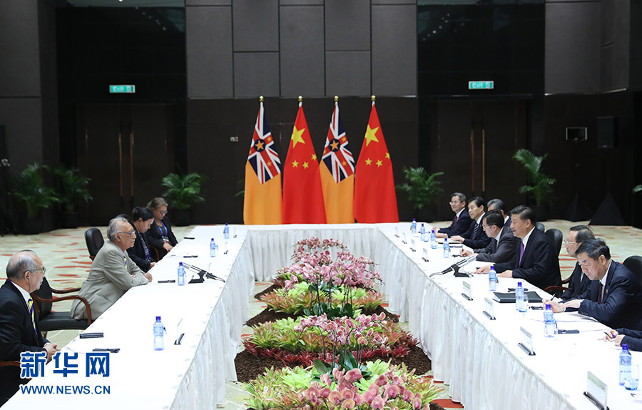 11月16日,國家主席習(xí)近平在莫爾茲比港分別會見建交太平洋島國領(lǐng)導(dǎo)人。這是習(xí)近平會見紐埃總理塔拉吉。 新華社記者 丁林 攝