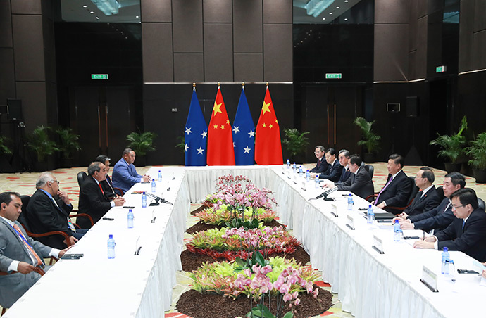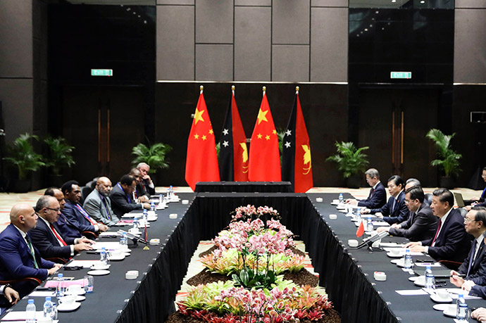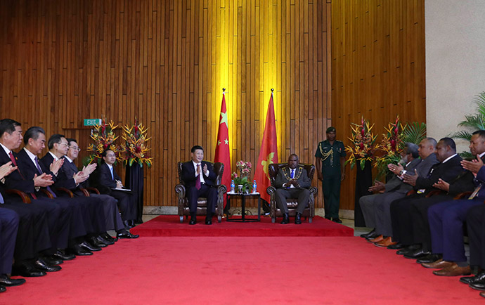 11月16日,國(guó)家主席習(xí)近平在莫爾茲比港分別會(huì)見(jiàn)建交太平洋島國(guó)領(lǐng)導(dǎo)人。這是習(xí)近平會(huì)見(jiàn)紐??偫硭P氯A社記者 丁林 攝