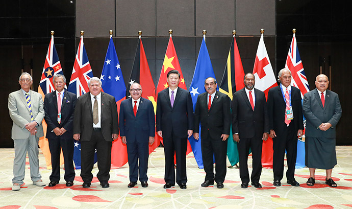 11月16日,國(guó)家主席習(xí)近平在莫爾茲比港同巴布亞新幾內(nèi)亞總理奧尼爾、密克羅尼西亞聯(lián)邦總統(tǒng)克里斯琴、薩摩亞總理圖伊拉埃帕、瓦努阿圖總理薩爾瓦伊、庫(kù)克群島總理普納、湯加首相波希瓦、紐埃總理塔拉吉等建交太平洋島國(guó)領(lǐng)導(dǎo)人以及斐濟(jì)政府代表、國(guó)防部長(zhǎng)昆布安博拉舉行集體會(huì)晤。習(xí)近平主持會(huì)晤并發(fā)表主旨講話。新華社記者 龐興雷 攝
