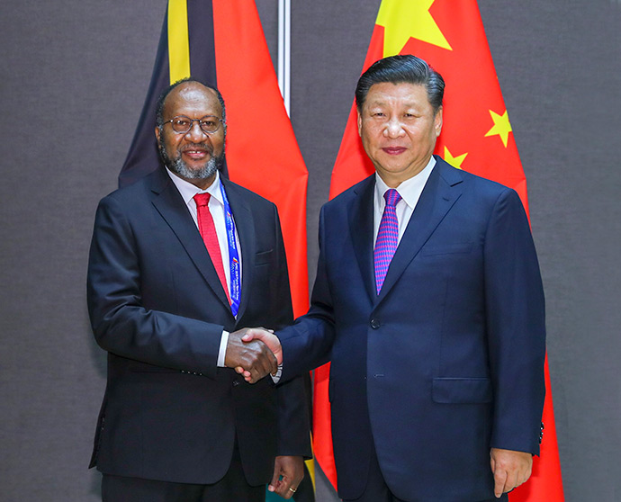 11月16日,國(guó)家主席習(xí)近平在莫爾茲比港分別會(huì)見(jiàn)建交太平洋島國(guó)領(lǐng)導(dǎo)人。這是習(xí)近平會(huì)見(jiàn)紐??偫硭?。新華社記者 丁林 攝