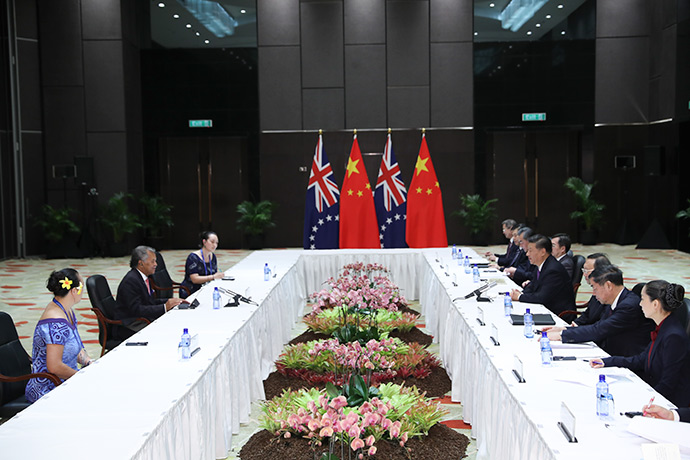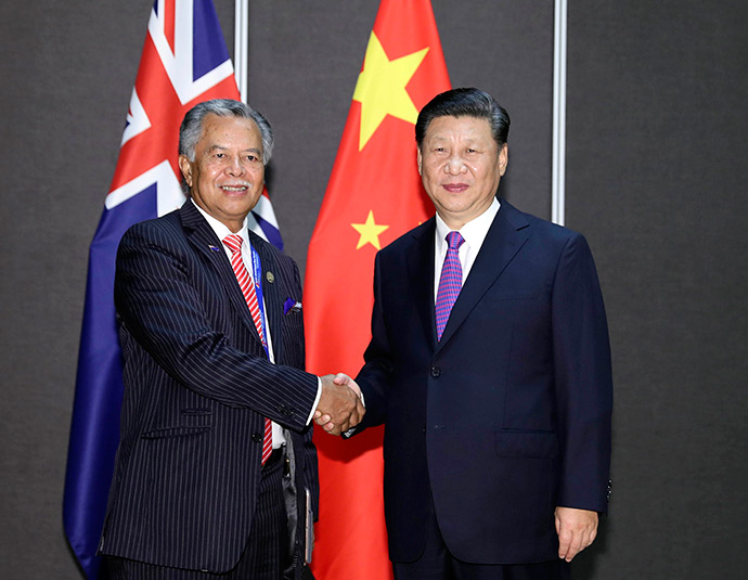 11月16日,國(guó)家主席習(xí)近平在莫爾茲比港分別會(huì)見(jiàn)建交太平洋島國(guó)領(lǐng)導(dǎo)人。這是習(xí)近平會(huì)見(jiàn)庫(kù)克群島總理普納。新華社記者 丁林 攝