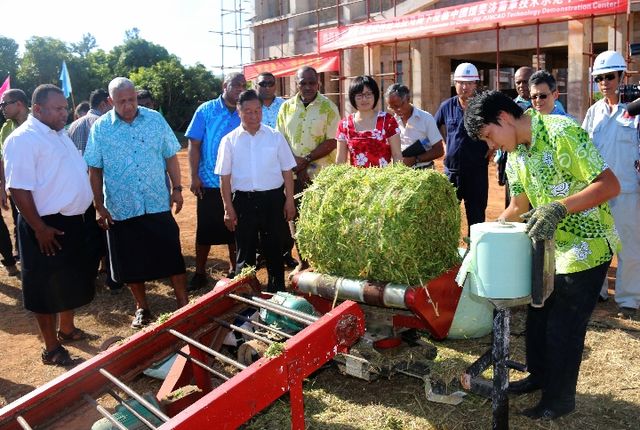 林占熺在中國(guó)援斐濟(jì)菌草技術(shù)合作項(xiàng)目第五期菌草技術(shù)培訓(xùn)班上為斐濟(jì)當(dāng)?shù)剞r(nóng)民演示如何處理菌草的技術(shù)。(資料圖片,林占熺提供)