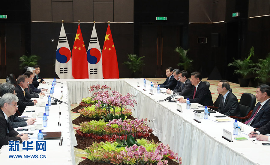 習近平指出,過去一年,我同總統(tǒng)先生達成的各項共識正得到有效落實,兩國關(guān)系穩(wěn)步改善和發(fā)展。我們要不斷深化中韓戰(zhàn)略合作伙伴關(guān)系,共同為促進地區(qū)持久和平和繁榮作出積極貢獻。雙方要繼續(xù)發(fā)揮好高層引領(lǐng)作用,尊重彼此核心利益和重大關(guān)切,加強溝通,建立和鞏固互信,繼續(xù)妥善處理好敏感問題。要重點推進共建“一帶一路”,加快兩國自由貿(mào)易協(xié)定第二階段談判,推動雙邊互利合作優(yōu)化升級。要加強在亞太經(jīng)合組織、二十國集團、中日韓等多邊框架內(nèi)協(xié)調(diào)和合作。